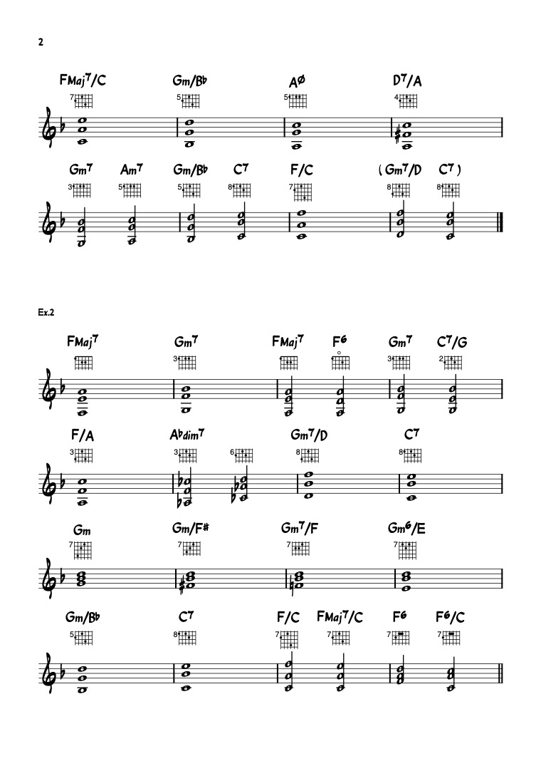 There are 2 separate choruses. The first one (Ex.1) stays rather simple. The second one (Ex.2) starts lower on the fretboard and has a little more movement.